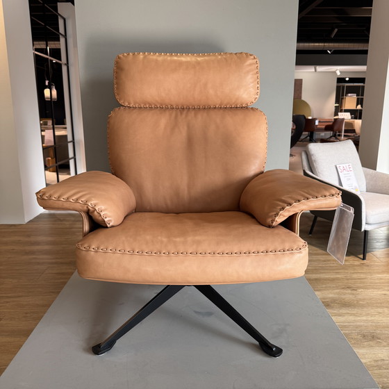 El sillón De Sede DS-31 combina diseño, artesanía y experiencia en cuero para crear una pieza de mobiliario tapizado de belleza atemporal. La artesanía se hace evidente en las costuras de banda, aplicadas con sumo cuidado y maestría a mano en los bordes de los cojines y los reposabrazos. La maestría en cuero se refleja en la suave tapicería. Modelo: DS-31 con respaldo alto. Cuero: Naturale 25 cuoio. Base: Base giratoria de 4 radios negra. Ancho: 92 cm. Fondo: 86 cm. Alto: 101 cm. Altura del asiento: 42 cm.