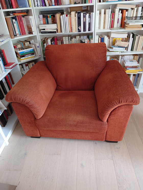 Sillón de Ikea en tela ocre-rojo-naranja. De tamaño imponente, es suave y cómodo. El respaldo es alto y ancho. Los reposabrazos también son altos y voluminosos.