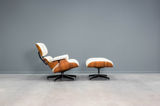 Tumbona Eames con una extraordinaria estructura de madera Santos. Ambos lados tienen un carácter muy diferente. ¡Una auténtica belleza! - Diseñador: Charles y Ray Eames - Productor: Herman Miller - Materiales: Cuero beige/Santos Palissander - Estado: ¡Excelente estado vintage!