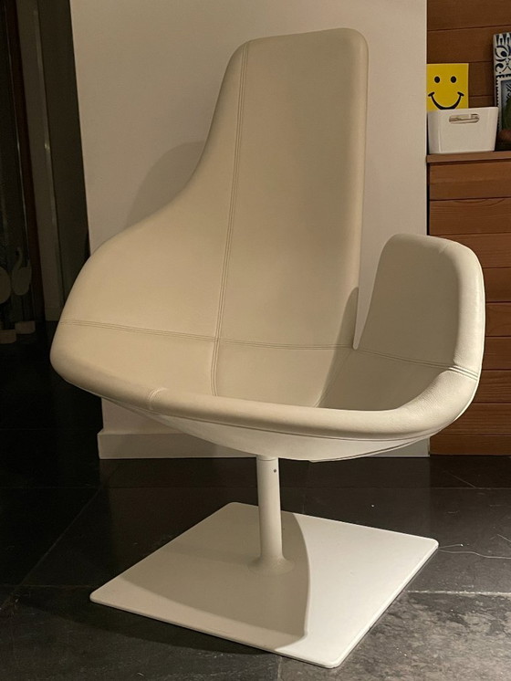 El sillón giratorio Fjord se remonta a 2002, cuando la diseñadora Urquiola creó su extensa colección Fjord. Lo primero que llama la atención de este singular sillón es, por supuesto, su medio respaldo. Gracias a sus 95 cm de ancho, este diseño característico no afecta a su comodidad. De hecho, su diseño único permite múltiples posiciones de relajación. Su amplia base garantiza que el sillón giratorio Fjord se mantenga firmemente asentado en el suelo y no se vuelque. El sillón tiene una estructura de acero y está acabado en cuero blanco con un suave acolchado de espuma fría.