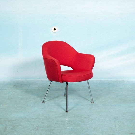 Silla ejecutiva Knoll vintage con estructura de acero cromado y tapizado rojo, un diseño atemporal de Eero Saarinen de 1950. Esta icónica silla, fabricada por Knoll International, se integra a la perfección en interiores de mediados de siglo, de estilo espacial o modernos. Su impactante diseño ofrece estilo y comodidad, ideal para el comedor, la oficina o como pieza de diseño en el salón. La carcasa de formas orgánicas está tapizada en tela roja de alta calidad. La silla cuenta con cómodos reposabrazos. El tapizado rojo se ha limpiado cuidadosamente y se encuentra en buen estado. Las piezas cromadas se han pulido, devolviéndole su brillo original. Lista para usar. Altura 80 cm, Altura del asiento 44 cm, Ancho 66 cm, Profundidad 55 cm.