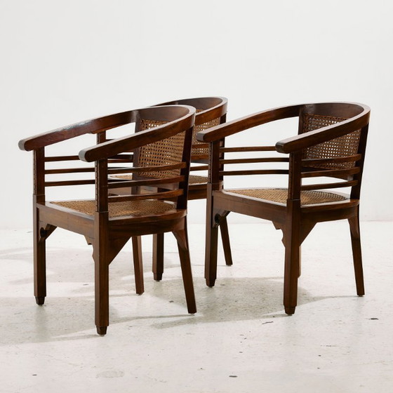 Sillón estilo art déco con asiento y respaldo de ratán y detalles originales. La superficie del sillón presenta arañazos, manchas y desgaste en algunas zonas.