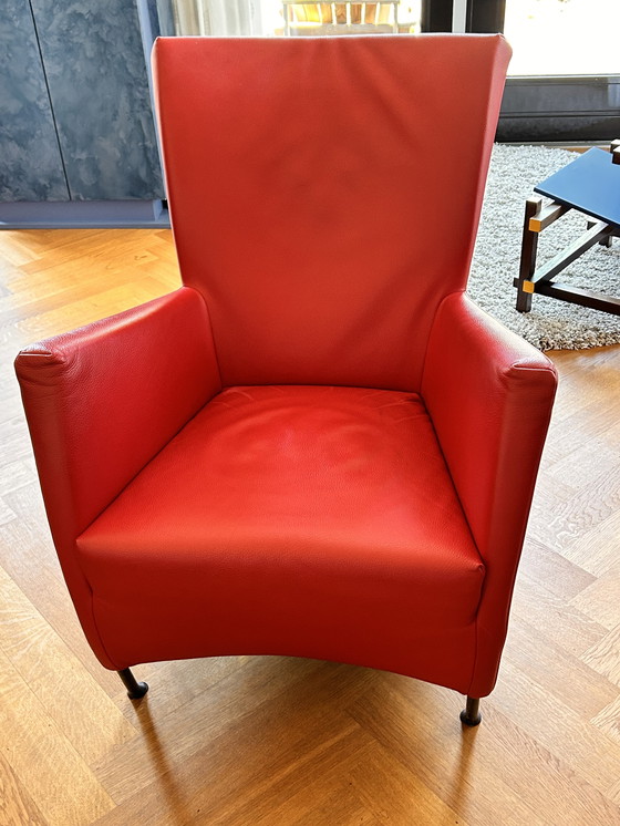 Se vende: Sillón Montis Windy de cuero rojo con patas negras. El sillón se encuentra en buen estado. Ofrece una excelente comodidad al sentarse, ocupando un espacio mínimo. Su respaldo ahuecado le confiere una gran comodidad. Además, su asiento alto lo convierte en un sillón de diseño ideal para incorporarse fácilmente. Diseñador: Gijs Papavoine. Este moderno sillón Windy presenta una llamativa tapicería de cuero rojo y elegantes patas de metal negro. Su diseño contemporáneo lo convierte en un complemento elegante para cualquier espacio. Ofrece comodidad y un atractivo estético, perfecto para relajarse o recibir invitados.