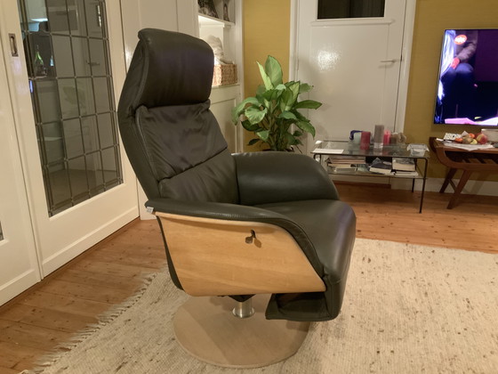 Este hermoso sillón giratorio está fabricado en cuero y madera y se encuentra en buen estado. El color del sofá es gris topo.