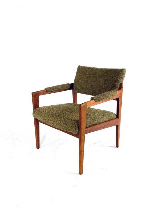 Sillón restaurado, diseñado por la marca de calidad Thonet, años 60. Preciosa estructura de teca maciza, con una forma orgánica y elegante. Preciosa y cálida tonalidad de teca con vetas visibles. Hermosas y elegantes uniones de madera. La estructura es sólida y se encuentra en buen estado. Presenta un acabado nuevo. El sillón ha perdido su aspecto antiguo (ver última foto) y se le ha aplicado un tapizado nuevo. La tela verde oliva a juego con la estructura hace juego. En resumen, la silla está como nueva y puede durar fácilmente otros 60 años, ¡lista para un nuevo hogar! Disponemos de facturas de la tapicería. Preciosa silla para una tienda, escaparate, restaurante o, por supuesto, para el hogar. Dimensiones: Alto 73 cm, Ancho 61 cm, Fondo 64 cm, Altura del asiento 43 cm.