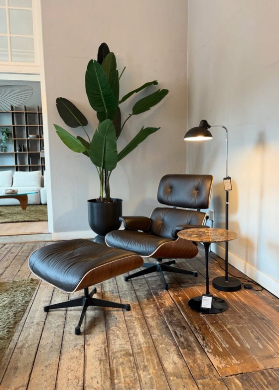 Esta silla original Vitra Lounge con reposapiés se usó exclusivamente como modelo de exposición, por lo que está prácticamente nueva. Acabado: nogal pigmentado en negro, patas cromadas en negro y cuero marrón oscuro (clase 1).