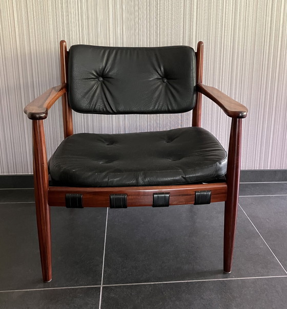 Juego de 2 sillones Cadett diseñados por Erik Merthen para Ire Möbil Suecia en la década de 1960. El armazón es de palisandro de Río y la tapicería original fue sustituida en su día por cuero artificial que necesita reemplazo (ver foto parte inferior del cojín del asiento). Teniendo en cuenta la edad, los sillones están en buen estado con signos normales de uso y desgaste.