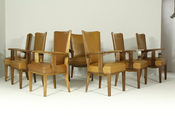 Juego de 7 sillas de roble de la década de 1920, de H. Pander. Posteriormente, fueron retapizadas profesionalmente en piel sintética. Se encuentran en muy buen estado, con algunas señales de uso.