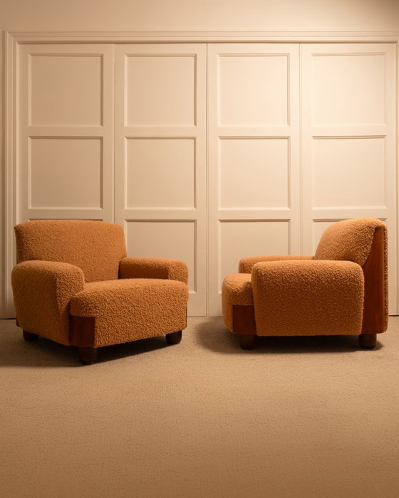 Par de sillones italianos de los años 70, completamente restaurados con una tela texturizada color café-tabaco de Designers Guild.