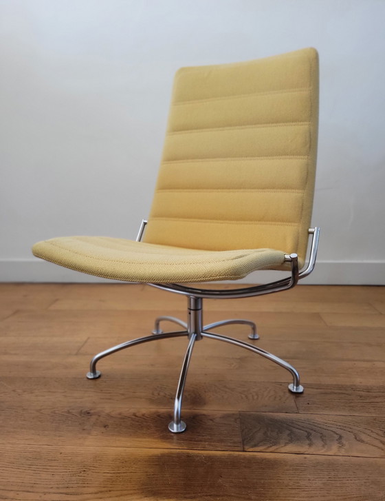 Sillones de aeropuerto diseñados por Jens Amudsen en la década de 1980. Diseño atemporal y elegante con gran comodidad. El sillón reposa sobre una base giratoria cromada. El asiento y el respaldo están tapizados con una suave tela de lana amarilla. Ambos sillones se encuentran en buen estado vintage. La base cromada muestra mínimas señales de uso. La tela de lana presenta decoloración por la luz solar. Dimensiones: 92 cm de alto, 54 cm de ancho, 54 cm de fondo y 40 cm de alto del asiento.