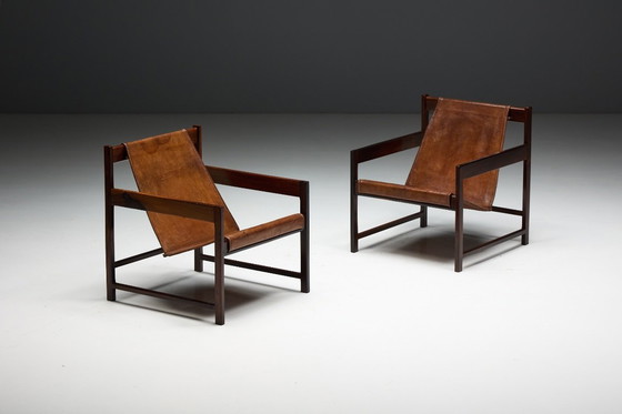 El sillón Lia se compone de una estructura de jacarandá macizo (palisandro brasileño) con líneas precisas y rectilíneas, suavizadas por un asiento suspendido de cuero grueso. El cuero tensado conforma asiento y respaldo en un solo gesto, ofreciendo comodidad ergonómica a la vez que realza la silueta arquitectónica del sillón. La rica tonalidad de la madera noble contrasta elegantemente con el cuero patinado, dando como resultado una pieza sobria, táctil y profundamente característica de la obra de Rodrigues. Precio por par.