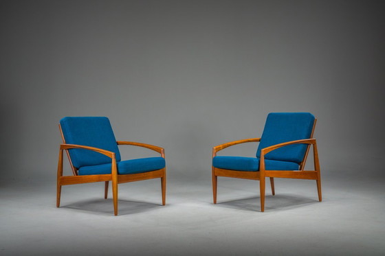 Un par de icónicas butacas modelo 121 "Paper Knife", diseñadas por Kai Kristiansen y fabricadas por Magnus Olesen en Dinamarca en la década de 1960.