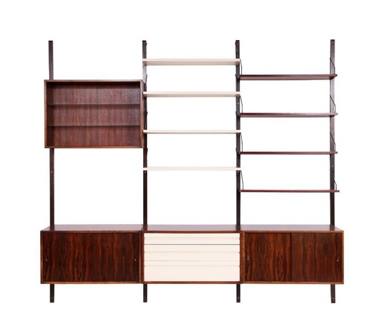 Precioso sistema de pared vintage de Poul Cadovius. Este sistema completamente autoorganizable consta de 3 armarios bajos y una vitrina.