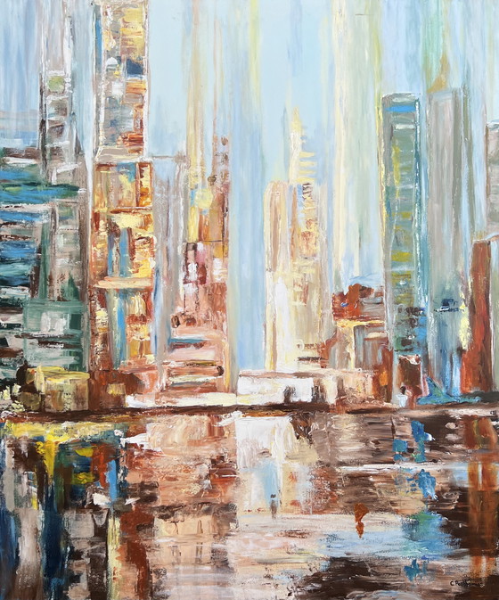 Este es un hermoso cuadro abstracto titulado "Skyline NY" de Corine Posthumus. La obra capta la vibrante esencia del horizonte de Nueva York con una mezcla de tonos azules, marrones y multicolores. Pintada sobre lienzo, muestra una interpretación única de la arquitectura urbana, lo que la convierte en un complemento perfecto para cualquier espacio moderno o contemporáneo. La pieza está en perfecto estado, lista para realzar su espacio vital con su estilo dinámico y artístico.