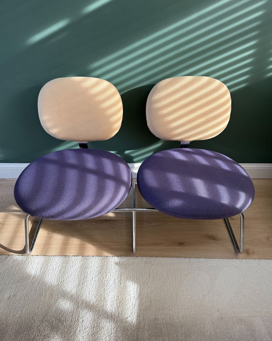 Este sofá Artifort vintage de dos plazas, llamado Vega 2, fue diseñado por Jasper Morrison en la década de 1990. Sigue disponible hoy en día y se puede pedir en cualquier combinación de colores imaginable. Este modelo tiene un acabado de tapicería en tonos crema y morado. Se ha limpiado a fondo y está listo para convertirse en el centro de atención en su nuevo hogar. Presenta un pequeño orificio en la tapicería del asiento derecho. Altura: 75 cm, Ancho: 114 cm, Fondo: 58 cm.