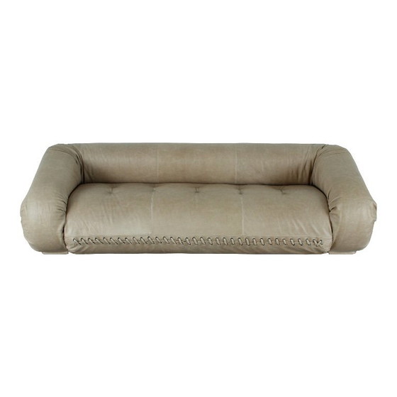 Esta pieza ha sido meticulosamente restaurada y tapizada en fina piel italiana gris, realzando sus líneas suaves y esculturales. El interior se ha retapizado con nueva piel de oveja natural, mientras que el colchón se ha sustituido por uno de espuma viscoelástica de alta calidad para una máxima comodidad y soporte.