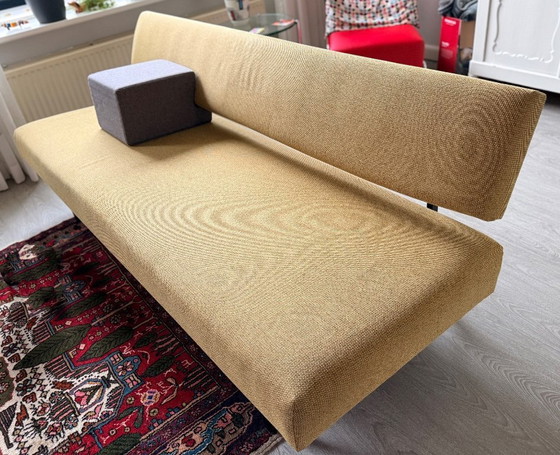 Diseño holandés de Rob Parry de la década de 1960. Sofá cama de diseño en tela amarilla con estructura de metal negro.