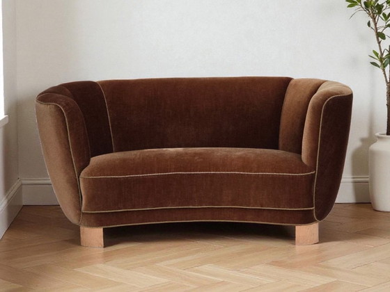 Sofá curvo danés de 2 plazas, década de 1960, tapizado en terciopelo marrón.