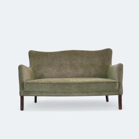 Sofá danés de dos plazas de los años 60. Terciopelo verde claro, patas de madera de haya y muelles en el asiento. Buen estado original: sin olores ni manchas, y construcción estable. Fabricado por un ebanista danés entre 1960 y 1965 aproximadamente. Diseño vintage escandinavo original, procedente directamente de Dinamarca. El sofá fue revisado por un artesano.