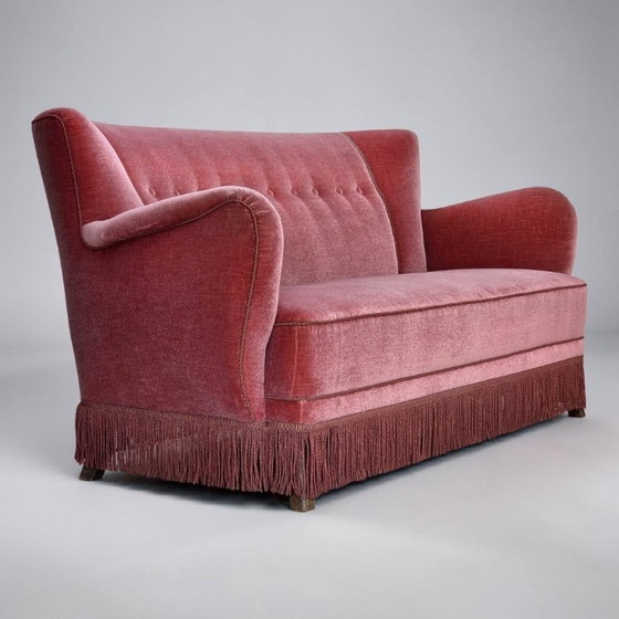 Sofá danés de 2 plazas de la década de 1970, tapizado en terciopelo rosa salmón y madera de roble.
