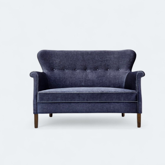 Sofá danés de 2 plazas de los años 60, terciopelo azul original para muebles, patas de madera de haya
