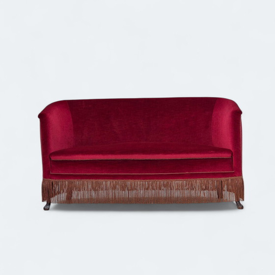 Sofá danés de dos plazas de los años 60. Terciopelo rojo, patas de fresno y muelles de latón en el asiento. El sofá fue retapizado por un artesano hace unos 15 años. Buen estado: sin olores ni manchas, y construcción estable. Correas nuevas bajo el asiento. Fabricado por un ebanista danés entre 1955 y 1960. Diseño vintage de artesanía escandinava original, directamente de Dinamarca.