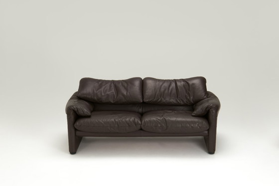 Un sofá de dos plazas 'Maralunga' con tapizado de cuero marrón, diseñado por Vico Magistretti para Cassina en la década de 1970. Cuenta con un respaldo ajustable que proporciona gran comodidad en ambas posiciones. El sofá conserva su estado original con un ligero desgaste y una pátina natural propia de su antigüedad.