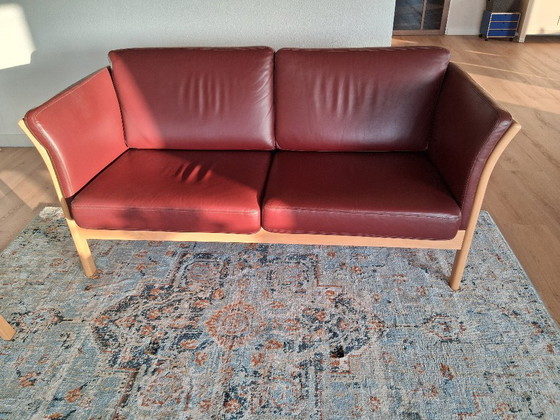 El sofá de 2,5 plazas y el sillón están hechos de haya barnizada transparente y cuero rojo oscuro 620.01. Fabricado en Dinamarca. En muy buen estado.