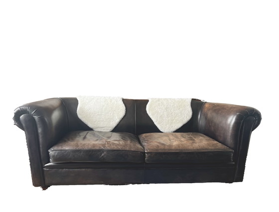 Un sofá de piel plena flor de Jan Frantzen, estilo Chesterfield, sin capitoné, realmente impresionante. El sofá ha sido usado, pero se mantiene en excelentes condiciones y es muy cómodo. El suave cuero está en excelentes condiciones y tiene un hermoso aspecto desgastado. Lo tengo desde hace un año, pero lamentablemente no combina con mi decoración.