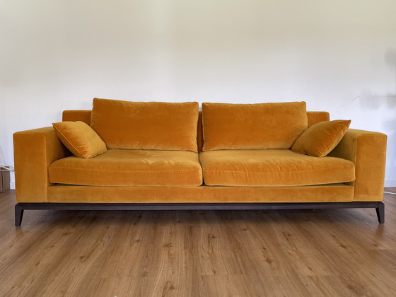 El sofá: Un amplio sofá de 3 plazas tapizado en un elegante terciopelo color azafrán/ocre, con una distintiva base de madera oscura con diseño arquitectónico. Elegante, cómodo y una pieza que sin duda llamará la atención: queda perfecto tanto en interiores contemporáneos como en ambientes cálidos y naturales.