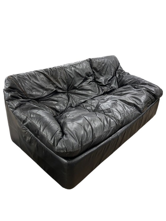 Este sofá de estilo atemporal se fabricó en Francia en los años 70. Consta de una base con un imponente cojín de asiento, revestido en cuero negro.
