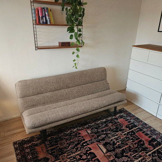 Este sofá minimalista, modelo C683, es un diseño icónico y atemporal. Diseñado en 1968 por el diseñador indonesio-holandés Kho Liang Ie, forma parte de la colección permanente de Artifort. Tapizado en una hermosa y gruesa tela de lana beige, tanto la base como el cojín suelto conservan su tapizado original. La elegante estructura de metal negro realza su carácter minimalista.