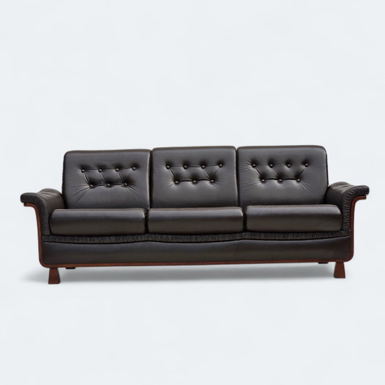 Sofá escandinavo de tres plazas de los años 70, tapizado en cuero, patas de teca y madera curvada.