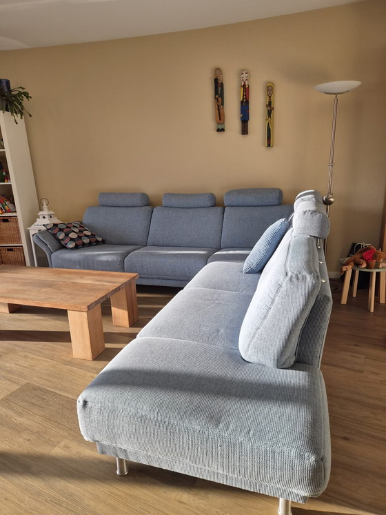 Precioso sofá esquinero original Musterring (modelo MR577) en tela tejida azul. El sofá se compone de 3 módulos independientes, incluyendo un módulo esquinero, y ofrece una gran flexibilidad de configuración.