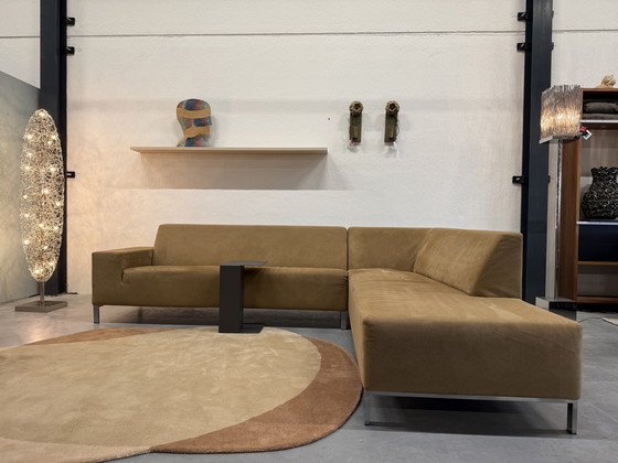Sofá esquinero Gelderland 6511 tapizado en Alcantara color marrón claro.