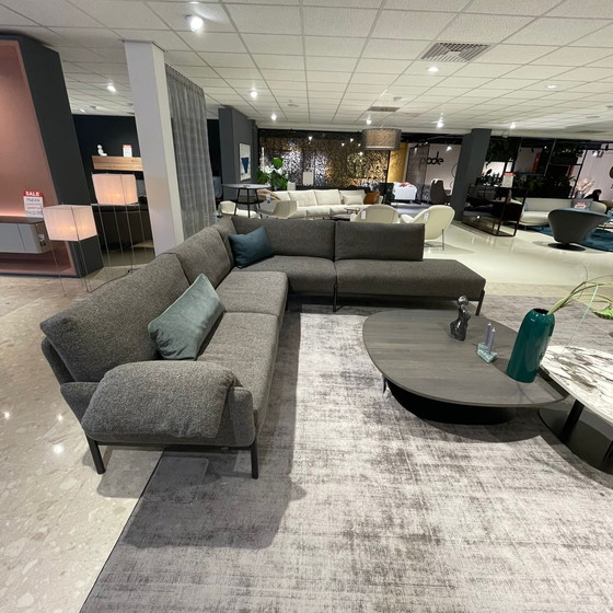 Sofá esquinero Leolux Enna. Dimensiones laterales: 310 x 315 cm. Tapizado: Moss 007 de Sacho. Estructura y patas: Epoxy Nuit Silk. Distribución: Dos secciones de asiento con un reposabrazos a la izquierda, sección esquinera y sección de chaise longue a la derecha. El precio no incluye envío ni montaje.