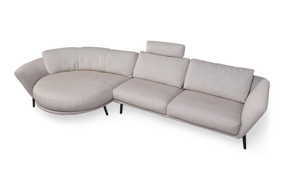 Sofá esquinero Rego de Leolux, compuesto por una chaise longue redonda con brazo izquierdo (dimensiones 150x161x83 cm de altura) y un módulo de 2x100 cm con brazo derecho (dimensiones 216x93x83 cm de altura) / Tapizado en tela Apollo 31 Star.