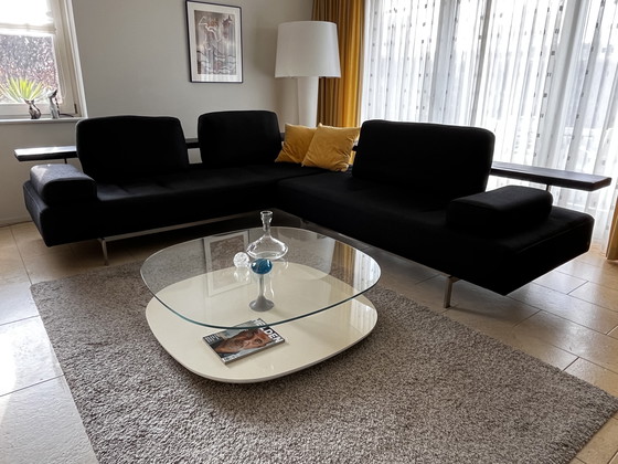 Este sofá esquinero Rolf Benz Dono realza instantáneamente cualquier estancia. Su elegante estructura de acero inoxidable, la superficie de cuero negro y sus generosos cojines se combinan para crear un equilibrio armonioso entre lujo y comodidad.