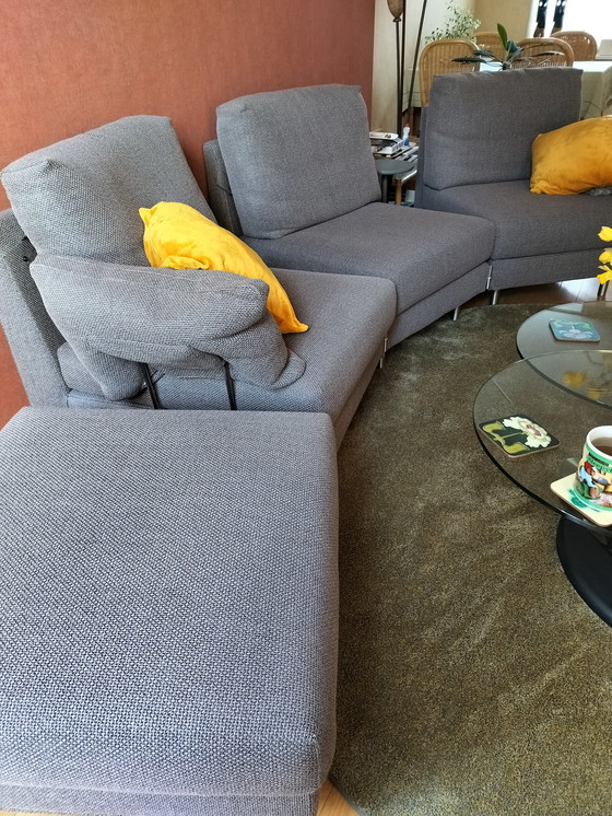 Conjunto de sofá usado compuesto por cuatro secciones que se pueden unir mediante bisagras: tres asientos y un reposapiés. En muy buen estado, con una hermosa tela tejida y patas metálicas.