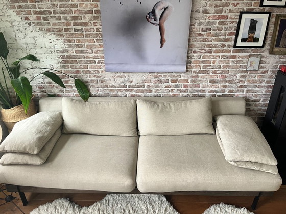Precioso sofá de la marca holandesa l’Authentique, modelo Ciel. Está hecho de lino lavado con base de nogal. Su color es beige/piedra. Tiene un año y medio, pero está en muy buen estado, ya que ha tenido poco uso. Presenta algunos pequeños desperfectos causados por el transporte (ver fotos). Su precio original era de 7120 €.