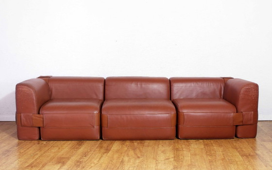 Sofá modelo 932 de Mario Bellini para Cassina, una pieza icónica del diseño italiano. Este sofá de cuero marrón encarna la elegancia y la comodidad, perfecto para realzar su espacio vital.