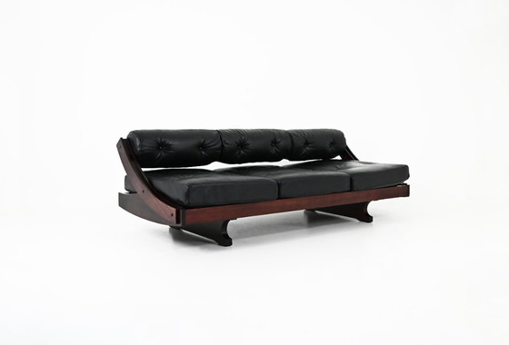 Sofá convertible en diván con cojín de cuero negro y estructura de madera, diseñado por Gianni Songia para Sormani. Modelo: GS195. Estampado Sormani. Desgaste propio del tiempo y el paso del tiempo.