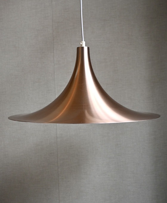 Sombrero de bruja en metal color cobre, inspirado en el Sombrero de bruja de Fog & Mørup. Esta lámpara colgante dorada evoca un instrumento musical y emite una luz suave y brillante.