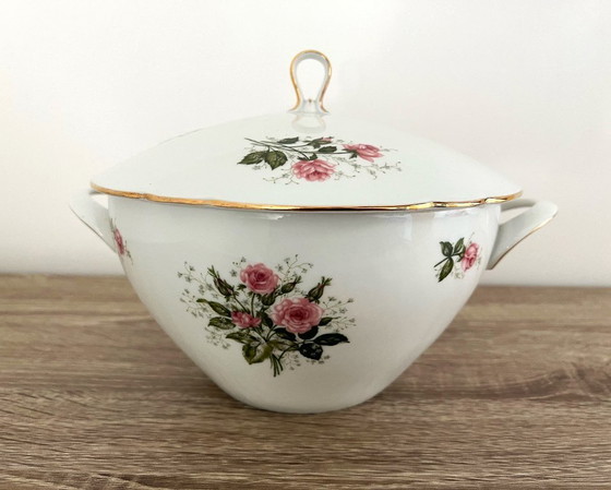 Decoración: Un encantador motivo floral de rosas rosadas y follaje verde, realzado por un delicado dorado en las asas, el pomo de la tapa y el borde.