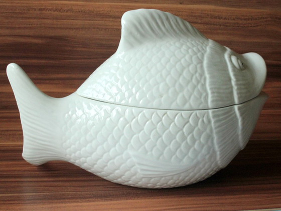 Sopera grande de cerámica blanca en forma de pez con tapa
