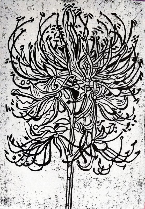 Cada línea ha sido cuidadosamente tallada a mano e impresa manualmente, preservando el ritmo orgánico de los espectaculares pétalos de la flor y sus largos y curvados filamentos.