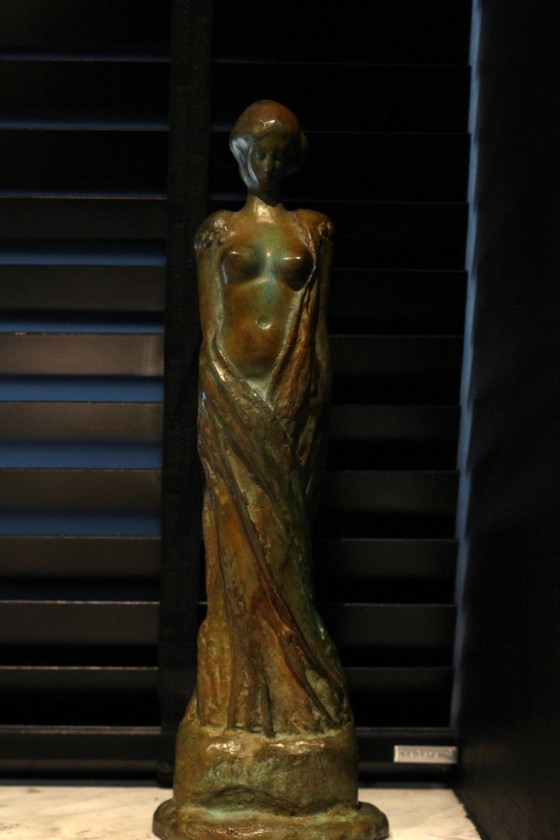 Presentamos la exquisita "Starende Dame" de E. Cornelis, una cautivadora escultura de bronce que encarna la elegancia y la gracia del diseño Art Déco. Esta impresionante pieza presenta una serena figura femenina, cuya forma está bellamente plasmada en líneas fluidas y sutiles detalles que evocan una belleza atemporal.