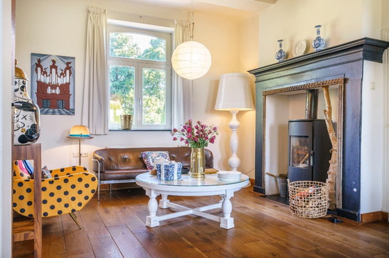 Deze ronde koffietafel heeft een royale diameter van 125 cm en een hoogte van 45 cm. Uitgevoerd in wit, met lichte gebruikssporen die eenvoudig kunnen worden overgeschilderd, waardoor het stuk naar wens kan worden opgefrist.