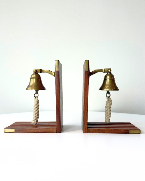 Sujetalibros de teca maciza que evocan la estética de la cubierta de un barco, con detalles de latón y campanillas funcionales.