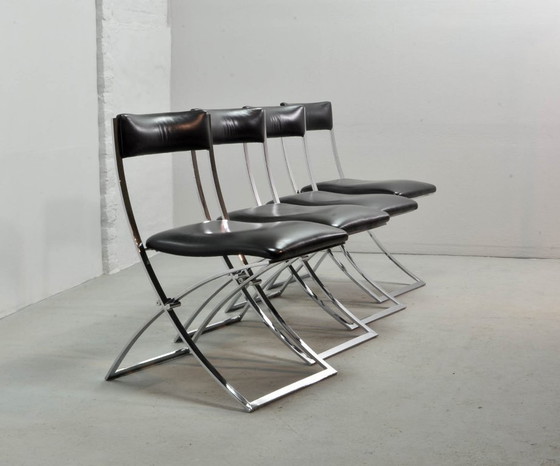 Marcelo Cuneo for Mobel Italia, Set of 4. Italy, 1970s. An absolute brilliant set of high quality foldable dining chairs designed by Marcello Cuneo for Model Italia in the 1970s. The chairs feature a very nice minimalistic designed chrome steel base which is upholstered with a fine soft black leather seating and backrest. The chrome steel base, which can be folded and the leather of all chairs are in a superb almost brand new condition. A must have for interior lovers with a heart for Italian design. Dimensions: Height: 78 cm, Width: 46 cm, Depth: 49 cm, Seat height: 45 cm.